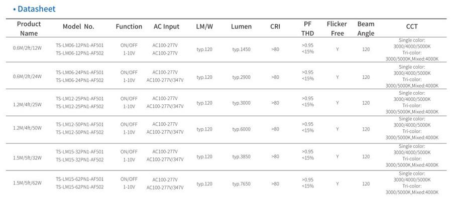 Various module Tool Free installation Max 200 meters multiple link 3-phase AC power source 5/7/11 wiring system Tri-color :3000/5000 mixed 4000K Various function : 1-10V /DALI / Micro-wave sensor / PIR sensor / 3H emergency |